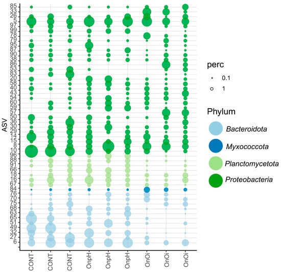 Relative abundance of the most abundant ASVs in the associated bacterial communities of the polychaete Hediste diversicolor. Circles arecolor-coded according to prokaryotic phylum and their size is proportional to the mean percentage (perc) of sequences per sample, as indicated by the symbol legend in the upper right corner of the figure below the phylum assignment legend. The following treatments are represented in the X-axis: CONT—control; OnpH—reduced seawater pH; OnOi—oil-contaminated; pHOi—reduced seawater pH and oil-contaminated.