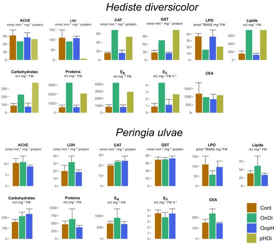 A battery of biochemical markers related to neurotransmission (acetylcholinesterase, AChE), anaerobic metabolism (lactate dehydrogenase, LDH), biotransformation (glutathione S-transferase, GST), oxidative stress (catalase, CAT; lipid peroxidation, LPO) and energy consumption (total lipids, total carbohydrates, and total proteins, energy available—Ea, energy consumption—Ec, and cellular energy allocation—CEA) were determined. These biochemical markers were selected based on previous studies which showed that abiotic and/or chemical stressors induced significant effects, at the biochemical level, on either H. diversicolor [,] or P. ulvae []. For the biochemical markers assay, 3–8 and 5–20 organisms were used for each replicate of H. diversicolor and P. ulvae, respectively. In H. diversicolor, and because of oil, it was only possible to obtain one replicate for the OnOi and pHOi treatments. The biochemical markers’ analyses were performed in the whole-body (soft tissues) homogenates of both organisms.