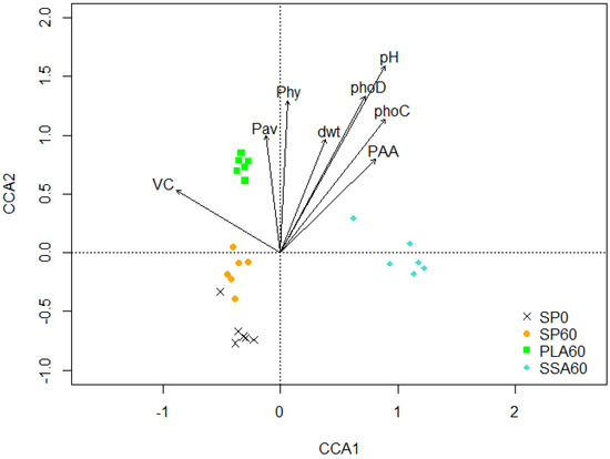 A CCA biplot of the ASV matrix obtained from the 16S rRNA amplicon sequencing results (Figure 2) revealed clear separations of all four treatments. The treatments SP0 and SP60 are separated from the two ash RDF treatments on the first axis, and SP60 and SSA60 are separated from SP0 and PLA60 on the second axis. A pairwise comparison using PERMANOVA confirmed significant separation (p ≤ 0.05) of all treatments after Benjamini–Hochberg correction for multiple testing. Canonical analysis environmental variable analysis revealed that vesicle colonization, P-mobilization capability from phytate and phosphonoacetic acid, bioavailable P, shoot dry weight, soil pH and phoC and phoD copy number significantly affected the bacterial community structures (p ≤ 0.05).