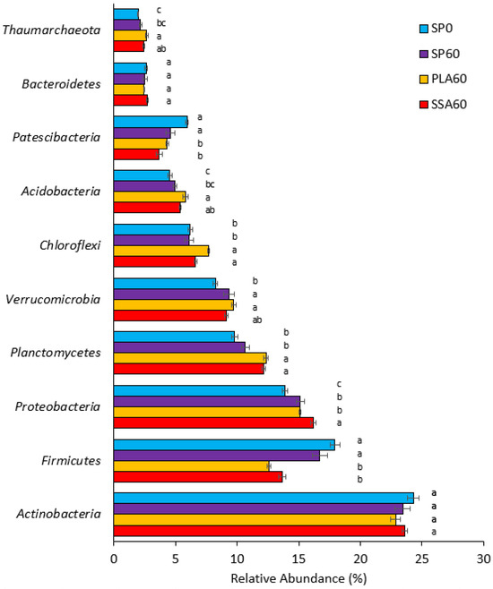 Horizontal bar plot of top 10 relative abundance phyla for SP0 (blue, 1st top), SP60 (purple, 2nd top), PLA60 (yellow, 3rd top) and SSA60 (red, bottom) (16S rRNA NGS data), error bars state standard error, significance determined via Kruskal–Wallis test and Wilcoxon post-hoc analysis and Benjamini–Hochberg correction, different letters a–c indicate statistically significant differences for each phylum (p ≤ 0.05), n = 6.