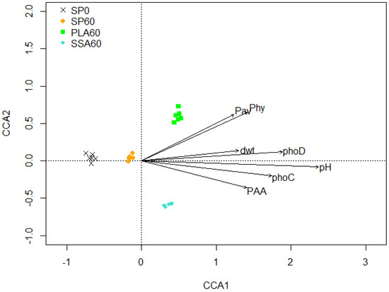 There were 3,169,711 phoD functional gene paired-end sequences obtained from the sequencing facility, out of which 1,934,508 (60.9%) were successfully merged in USEARCH. Of the merged sequences, 612,338 were matched with zero differences. In total, 1,285,676 (66.6%) of the merged number of sequences passed the filter criteria and 765,090 (88.4%) of those were singletons. In total, 5051 OTUs were picked at a 75% similarity threshold and 2476 chimeral sequences (2.5%) were removed. Finally, 1,449,560 sequences were mapped to OTUs. The alpha diversity index Simpson was significantly lower for the PLA60 treatment (0.987 vs. 0.988–0.989) compared to all other treatments, and all other alpha diversity estimators (i.e., Shannon, ACE, Chao1) showed no significant differences between the treatments (Supplementary Table S3). The phoD amplicon NGS data based CCA biplot showed significant separation (p ≤ 0.05) of all treatments (Figure 4; PERMANOVA, Adonis, confirmed via Benjamini–Hochberg correction). PLA60 and SSA60 were separated from the SP0 and SP60 treatment on the first axis, and on the second axis a separation between PLA60 and SSA60 is visible. Various environmental parameters were significantly affecting the phoD harboring community that included available P, L. perenne dry weight, soil pH, phoC and phoD gene copy numbers, phosphonate and phytate utilizing bacteria (MPN).
