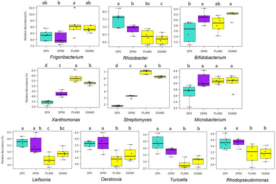 The genera Leifsonia, Oerskovia, Rhodopseudomonas and Turicella were significantly relatively lower in abundance (p ≤ 0.05) in the ash RDF treatments compared to the control SP0 and SP60 fertilizer. Rhizobacter displayed the highest relative abundance in the P-free SP0 treatment. For the genera Frigoribacterium, Streptomyces and Xanthomonas the PLA60 treatment had the highest relative abundance, followed by SSA60, while the SP60 treatments displayed significantly lower relative abundances. The genus Microbacterium seemed to be positively affected by the P addition, all P-fertilized treatments had a significantly higher relative abundance compared to SP0. Lastly, the genus Bifidobacterium was significantly relative higher in abundance in the SP60 and SSA60 treatment, while it was similarly relative abundant in PLA60 and SP0.
