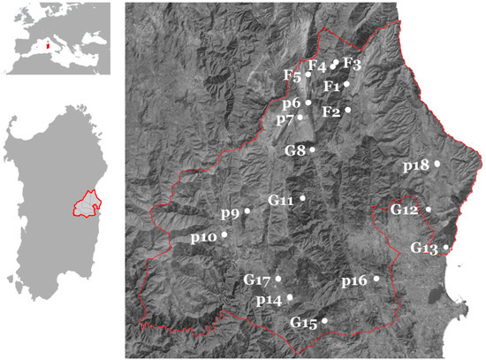 The monitored area covered more than 800 km2 in east-central Sardinia (Figure 2), and approximately 85% was publicly owned and protected. Genetic richness characterizes the area, featuring 19 habitats marked with Natura 2000 and EUNIS codes (Figure 3) summarizing the landscape traits and protection measures [37]. For the purposes of communicating the benefits of biodiversity to local communities, we named the study area Terre dell‘Aquilegia; this helped emphasize how the genetic richness extends beyond the administrative limits of municipalities and has proven effective in encouraging the cooperation of mayors in its implementation. A further peculiarity of the monitored area is that it overlaps with an area of the planet in which the phenomenon of human longevity has been evidenced by the presence—greater than the demographic average—of healthy ultra-centenarians. Research has highlighted many epigenetic factors related to lifestyles and, particularly, to Mediterranean nutrition and diet in these areas, called Blue Zones [38].
