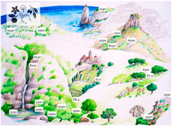 The landscape in this research is summarized by the illustration in Figure 3, which was created during the monitoring period, showing distinctive geomorphological features and habitat codes. The analysis of the Mediterranean plants in this study provides a better understanding of the aesthetic value and the enjoyment of shapes, colors, and scents. The sense of well-being experienced in nature while hiking trails and admiring the naturalness of elements, as well as forest bathing, are aspects of the landscape that produce enjoyment. Plants observed along the monitoring pathways were reported in the biodiversity plant file, as they also reveal the effects of human activities along the paths known by the local communities. The euphorbias (Euphorbia spp.), asphodels (Asphodelus microcarpus), brooms (Genista corsica, Cytisus spp.), oleanders (Nerium oleander) and hellebore (Helleborus argutifolius Viv.), which tinge the valleys and impervious walls of this case study’s area, are toxic plants to animals and exhibit ecological forms of greater fire resistance.