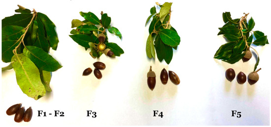Photographs of the acorns and leaves of Quercus ilex L.: ordinary holm oak (F1–F2) and those with a sweet character (F3, F4, and F5).