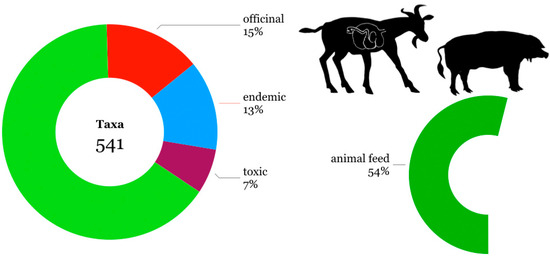 The number of taxa categorized as medicinal, endemic, toxic, and animal feed, in percentage, surveyed along the monitoring pathways.
