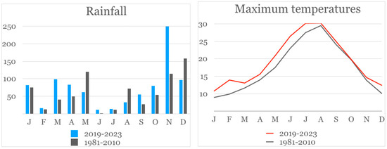 Climatic changes in the Mediterranean region have caused concern [42,43,44] about the negative impacts of particularly extreme events with rainfall and flooding, which have become more frequent in recent decades, as well as rising temperatures. Data on rainfall and average maximum temperatures were considered for agroforestry purposes and to share the importance of actions to protect biodiversity, as well as forest cover and mitigation measures [45]. Data for the years 2019–2023 were obtained from the daily records of 5 meteorological stations in the given area. The meteorological stations were operated by the Meteo-Climatic Department of the Region of Sardinia [46], which also provided climate data for the 30-year period 1981–2010. Daily rainfall and maximum temperature averages in different months from 2019 to 2023 were compared with the climate data from the 30-year period 1981–2010 from the same area.