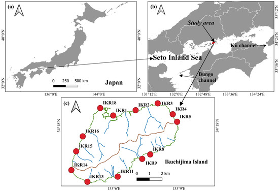 Map showing the location of the study area and sampling sites, with red dots indicating sampling stations. (a) Japan; (b) Seto Inland Sea and (c) Ikuchijima Island.