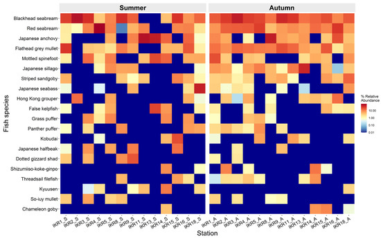 Heatmap of relative abundance (%) of dominant fish species in autumn and summer, determined by eDNA metabarcoding at each station. The heatmap colors represent the relative abundances of fish species. Sorting is in proportion to relative abundance, with a decreasing trend from top to bottom.