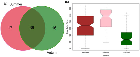 (a) Venn diagrams comparing number of fish species detected by eDNA in the summer and autumn; (b) boxplot of ANOSIM results of seasonal differences in fish communities on Ikuchijima Island between summer and autumn. On the x-axis, ‘between’ boxplot means between-season variation. Single dots indicate values outside of the interquartile range.