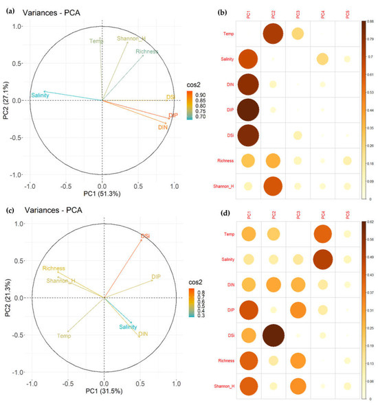 Principal component analysis (PCA) results of influential environmental factors on fish species richness and fish diversity index during (a,b) summer and (c,d) autumn. (a,c): The correlation circle obtained from the PCA; the color palette corresponds to the different cos2 values, and a higher cos2 value indicates a larger contribution of variation to the principal component; the percentage (%) indicates the proportion of variance; (b,d): PCA corrplot showing cos2 of variables in all principal component (PC) dimensions.