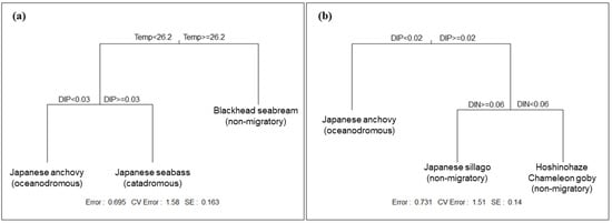 Multivariate regression tree analysis of the relation between relative abundance of fish species and environment factors in (a) summer and (b) autumn. The statistics at the bottom of the figure are the residual error (Error), the cross-validated error (CVError), and the standard error (SE).