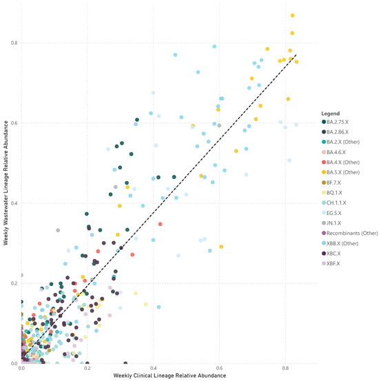 Despite the advantages of WBE, the importance of maintaining clinical sequencing alongside wastewater surveillance should not be overstated. Ultimately, WBE provides information at the population level. Clinical sequencing, however, offers insights into the clinical implications of new lineages [40], including their implications on disease severity, antiviral suitability, and vaccine efficacy [41]. Moreover, it allows confirmation of the presence and effects of specific sub-lineages in individual patients, a dimension beyond the scope of wastewater analysis. Clinical sequencing also validates and complements wastewater findings, ensuring a comprehensive understanding of the virus’s behavior and evolution. Thus, integrating both wastewater and clinical sequencing approaches is fundamental to a robust, holistic surveillance strategy in the context of COVID-19. The strong and significant correlations noted throughout this study indicate that the relative abundances of lineages in wastewater may continue to reflect community clinical trends, despite the evolving dynamics of clinical surveillance strategies.