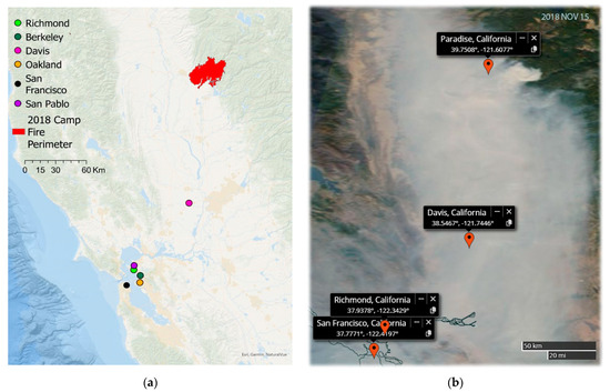 (a) 2018 Camp Fire perimeter and locations of samples acquired in Richmond, Berkeley, Oakland, and San Pablo. The map was generated using ArcGIS Pro (ESRI, Redlands, CA, USA) and wildfire perimeter data [39]. (b) NASA satellite image for Camp Fire smoke [40].