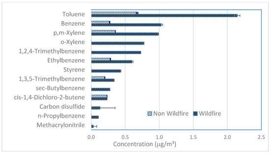 Mean concentrations of major detected VOCs compared between wildfire and non-wildfire periods. (Some standard deviation error bars are too small to be seen).