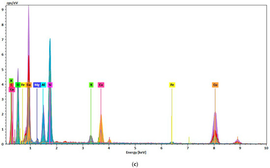Carbonaceous PM and inorganic dust and ash collected using the OFPS were analyzed using SEM to examine particle morphology and elemental composition to help understand any unique types of particles collected during the wildfire period. Figure 9 shows typical low-magnification images of particles collected using the OFPS. As expected, a wide range of particle sizes were present, with visible particles or ash suspended in the air during the wildfire episode. The EDS analysis of the suspended largest particles (Figure 9a) showed that besides carbon, over 90% of these particles’ compositions comprised inorganic components, such as aluminum, silicon, and iron, as shown in the spectrum and the normalized mass concentration table. Although these inorganic elements are consistent with ash, they also are common elements in road dust or PM from building construction and demolition.