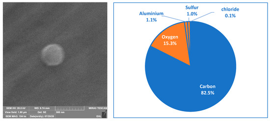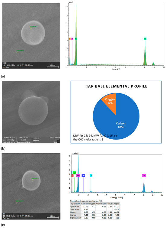 Examined under a higher magnification, the samples collected during the fire episode contained an abundant number of spherical particles consistent with organic carbon tar balls [27], as shown in Figure 10. Different sizes (250 nm–3 µm) of spherical particles and agglomerates are shown in Figure 10, and most of them had carbon as their major constituent. It is possible that some of the larger, super-micron spheres were biogenic rather than tar balls. Besides individual tar balls, the last two images in Figure 10 appear to be large agglomerates of tar balls, indicating that many different sizes of smoke particles co-existed in the air due to agglomeration.