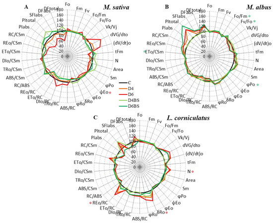 | SFIabs = RC/ABS × φPo × ψEo | Structure–function index, which reflects changes that “favor” photosynthesis | [44] |