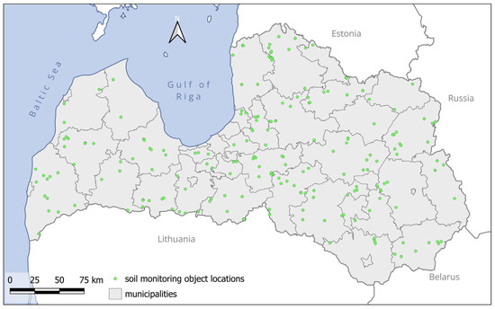 The objective of the study was to assess SOC concentration and stocks in mineral soils, both in cropland and grassland, in Latvia, depending on the WRB international soil classification system and soil texture class. Additionally, the study aimed to explore the relationships between SOC and other soil chemical properties—soil total nitrogen (TN), extractable content of potassium (K), calcium (Ca), magnesium (Mg) and phosphorus (P) concentrations, as well as soil pH (H+ concentration). Based on the results of previous studies in Lithuania and Latvia, as well as studies outside the Baltic states, we hypothesized that SOC is significantly higher in grassland, compared to cropland.
