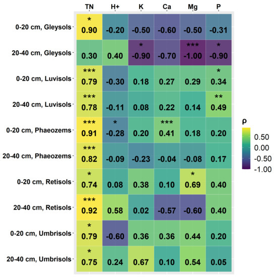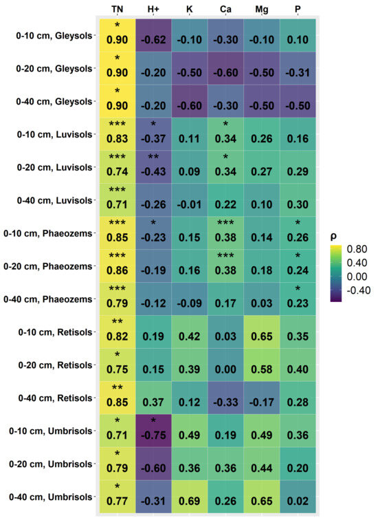 When estimating correlations between SOC concentrations and other soil chemical variables in study sites in cropland, very strong (|ρ| ≥ 0.8), significant correlations were found between SOC concentration and TN content in the soil. These correlations were observed in the 0–20 cm layer of Gleysols, the 0–20 cm and 20–40 cm layers of Luvisols, the 0–20 cm and 20–40 cm layers of Phaeozems, the 0–20 cm and 20–40 cm layers of Retisols, as well as the 0–20 cm layer of Umbrisols. Statistically significant strong, negative correlations were observed for Gleysols in the 20–40 cm layer between SOC concentration and soil K, Ca, and P concentrations. Additionally, positive, strong (|ρ| ≥ 0.6), significant correlation was identified between SOC concentration and TN content in the 20–40 cm layer of Umbrisols. Moderate (|ρ| ≥ 0.4) significant correlations were found between SOC concentration and C/N ratio in the 20–40 cm layer of Phaeozems, SOC concentration and soil Ca concentration the 0–20 cm layer of Phaeozems, and between SOC concentration and soil P concentration in the 20–40 cm layer of Luvisols. Also, several weak (0.2 ≤ |ρ| < 0.4), but significant, correlations have been observed. Spearman correlation coefficients and their significance are shown in Figure 2.