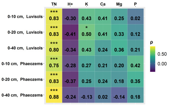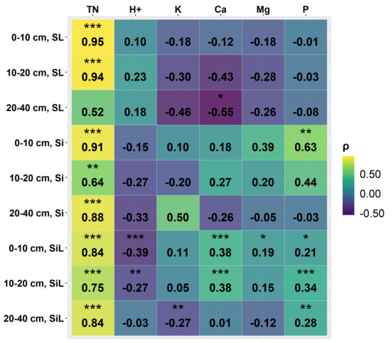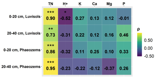 When estimating correlations between SOC concentrations and other soil chemical variables in study sites in grassland, very strong, significant correlations were found between SOC concentration and TN content in the soil. These correlations were observed in the 0–20 cm layer of Luvisols, and the 0–20 cm and 20–40 cm layers of Phaeozems. Strong significant positive correlations were also found between soil SOC and C/N ratio in the 20–40 cm layer of both Luvisols and Phaeozems. A moderate significant correlation was found between SOC concentration and soil H+ concentration in the 0–20 cm layer of Luvisols. Spearman correlation coefficients and their significance are shown in Figure 3.