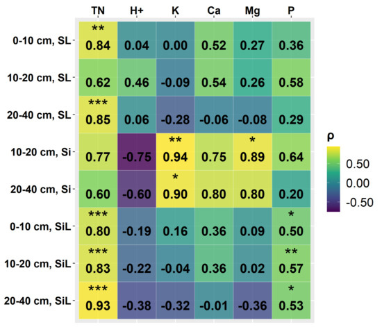 Spearman correlation coefficients (ρ) between SOC stock and other soil chemical parameters stratified by soil texture groups and soil layers in study sites in grassland. Significance levels are indicated with asterisks (*: 0.01 ≤ p < 0.05, **: 0.001 ≤ p < 0.01, ***: p < 0.001). The color gradient illustrates correlations, with a transition from the strongest positive (yellow) to the strongest negative (purple).