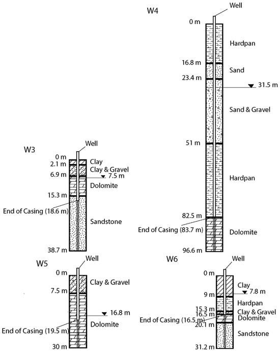 The well-boring log reports are included in Figure 1 (W1–W6) and Figure S2 (W7–W11). As can be seen from the well boring logs, the depth of the wells ranged from 30 m to 96.6 m beneath the ground surface (bgs), and the static water level varied between 7.5 m and 31.5 m bgs. All wells were screened within the dolomite and sandstone aquifer.