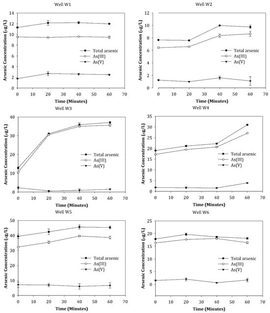 To examine the potential temporal dynamics of arsenic concentrations and speciation during well pumping and water usage, water samples were collected from wells W1 to W6 when the wells were continuously pumped. The results are shown in Figure 2.