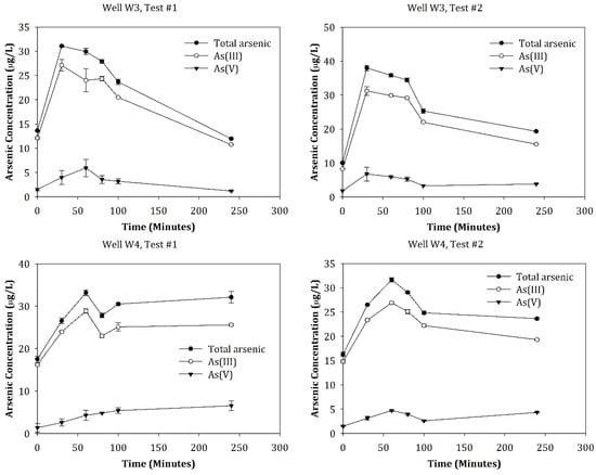 For wells W2, W4, and W5, there were clear increases in arsenic concentrations during pumping (Figure 2). Particularly, although the initial arsenic concentrations in well W2 was 7.66 ± 0.00 (µg/L) before water pumping, it approached ~10 µg/L (i.e., the MCL) following 40 min of pumping. It seems that the increase in total arsenic concentrations was primarily caused by the increase in As(III) concentrations. Accordingly, the fraction of As(III) to total arsenic also increased over time. For instance, the fraction of As(III) increased from 81.85% to 86.75%.