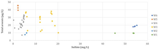 Reaction (1) would suggest that along with the oxidation of arsenic-containing minerals such as pyrite, sulfate could also be introduced into the well water. The synchronizing patterns in arsenic and sulfate concentrations were reported in laboratory batch experiments, where sulfate concentrations were ~0 upon initial exposure to oxidants such as oxygen []. Data obtained from the field, however, indicated that there were generally insignificant correlations between well arsenic (total arsenic or As(III)) and sulfate concentrations [,]. In this research, the relationship between arsenic and sulfate concentrations during well pumping is shown in Figure 4. Consistent with previous field studies [], a clear trend between the two concentrations was not observed. In the private drinking water wells selected for this research, the sulfate concentrations were generally 3 orders of magnitude higher than arsenic concentrations. It was likely that the amount of sulfate produced from the oxidation of the pyrite nodules was negligible relative to high concentrations of sulfate in the water before water was pumped. Further studies are warranted to investigate the mechanisms underlying the potential strong variations in arsenic concentrations during well pumping under field conditions.