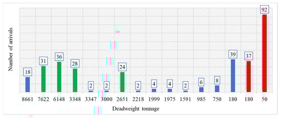 The data of shipping routes to and from Mytilene were obtained by utilizing the database of Marine Traffic S.A. This database played a crucial role in providing comprehensive information, including the number of arrivals per ship, deadweight tonnage (DWT), draught, distance traveled, and ship types. Additionally, publicly available data were used in this study to identify the engines employed by each shipping vessel. The data depicted in Figure 1 show the arrivals at the Mytilene port categorized by deadweight tonnage (DWT). Passenger ships, specifically those with a DWT of 6148, represent a notable portion, with 36 arrivals recorded in June. Smaller passenger vessels operating on short-sea international routes, within the range of 50 to 180 DWT, contribute to a total of 151 arrivals, predominantly servicing the MJT-AYK international route. Other passenger ships with relatively higher DWT, such as those measuring 3348 DWT (28 arrivals) and 7622 DWT (31 arrivals) in June 2019, also play a substantial role in the overall arrival figures. Passenger ships dominate the total arrivals, accounting for 42.4%, followed by ro-ro/passenger vessels at 33.9%, and ro-ro cargo ships at approximately 3.5% of the total arrivals. These three categories, operating on regular schedules, collectively constitute around 80% of the arrivals. Additionally, there are other vessels engaged in vital supply services, including the transportation of heavy fuel oil and cement to the island. It is worth noting that Figure 1 excludes military vessels and other non-scheduled shipping practices that could impact the total arrival count.