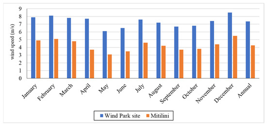 The energy analysis utilized RETScreen, which is free software that was launched by Canada’s Ministry of the Environment. It is developed in a Microsoft Excel environment and is designed for (among other uses) assessing energy production from potential projects involving renewable energy sources. RETScreen not only provides information about emissions but also evaluates the economic aspects and risks associated with specific projects [22]. This tool is valuable for decision-making, assessing the feasibility of future renewable energy projects, and identifying additional solutions for profitable energy production. The energy analysis component evaluates the generated energy from the proposed energy system. The cost analysis estimates the initial and annual costs for the project. The emission analysis assesses the reduction in greenhouse gas emissions resulting from the development of renewable energy sources. Lastly, the financial analysis calculates the net present value of the project, offering insights into its overall economic sustainability. In this framework, this study considers the development of a 20 MW wind park that can electrify the in-port operations of Mytilene port. Figure 2 utilizes the real average wind data of Lesvos island as it has been presented by the publicly available data provided by HEDNO S.A., i.e., the Hellenic Electricity Distribution Network Operator [23]. The average wind speed data of the existing operating wind parks are considered as a baseline for our analysis. On the one hand, the exact geolocation for the installation of the wind park exceeds the scope of this study, and on the other hand, it cannot be assumed that any new installations will be vastly different than the already-operating ones.