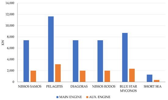The power requirements of both main and auxiliary engines are significant considerations for passenger shipping vessels, particularly those with extended hoteling times in the port of Mytilene. The main engines, responsible for propulsion, play a crucial role in providing the necessary power for the vessel’s movement. Simultaneously, auxiliary engines support various onboard functions during hoteling, such as maintaining lighting, air conditioning, and other essential systems. The power capacity of these engines is determined by the vessel’s size, design, and the range of amenities and services offered during hoteling. Understanding and optimizing the power of both main and auxiliary engines are key factors in ensuring the operational efficiency and passenger comfort of these vessels during their extended stays in the port of Mytilene. Figure 3 presents the nominal power of main and auxiliary engines for the passenger shipping vessels with the highest hoteling times in Mytilene port.