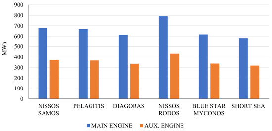 The total energy demand for main and auxiliary engines for the passenger shipping vessels with the highest hoteling times in Mytilene port (June 2019).
