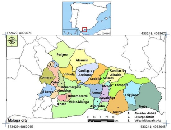 The population studied in this research was drawn from a public hospital in a coastal county in southern Spain known as Axarquía, located in the province of Málaga. This region comprises 23 municipalities and has a total population of 160,757 inhabitants as per the census data from the National Statistics Institute (INE) in 2021 (see Figure 1). The internal differences between the municipalities in this shire are substantial, in terms of both elevation (reaching heights of up to 2065 m above sea level) and population size. For example, the county seat, Vélez-Málaga, has a population of 82,967 inhabitants, while the least populated municipality has only 173 residents. The evolution of the population between 2010 and 2021 is detailed in Tables S1 and S2 in the Supplementary Material.