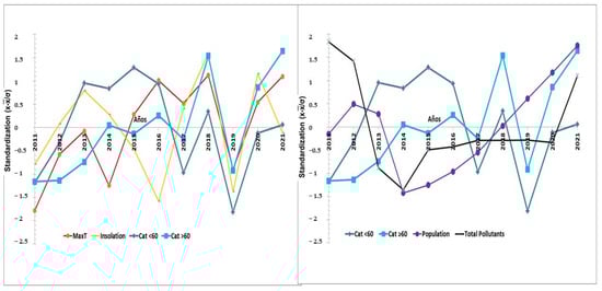 Standardized comparison of the inter-annual temporal changes in temperature, insolation, and standardized cataract incidence (left); and population, air pollution, and standardized cataract incidence (right) in the East Malaga-Axarquia health area. Note: Cat = standardized cataract incidence.