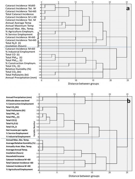 In this case (Figure 3a), the model shows two large clusters associated through the minimum distance between variables. The first cluster includes almost all the variables related to cataracts (variables 2 to 9), which are close to temperatures (average, maximum and absolute maximum; variables 14, 15 and 16, respectively), insolation (variable 17), the agricultural and service employment (variables 10 and 13), and the total N2O emissions (variable 23). The second cluster contains the standardized cataract incidence in men under 60 years old (variable 1), industrial and construction employment (variables 11 and 12), relative humidity and precipitation (variables 19 and 18), and most constituents (variables 21, 22, 24, 25, and 26).