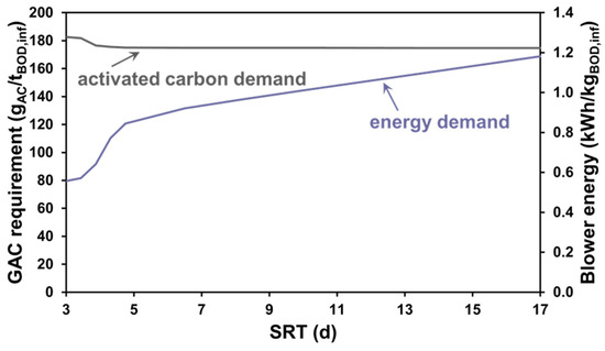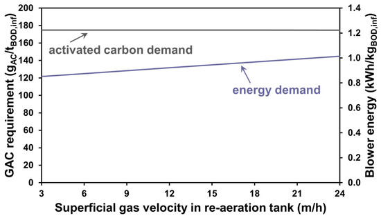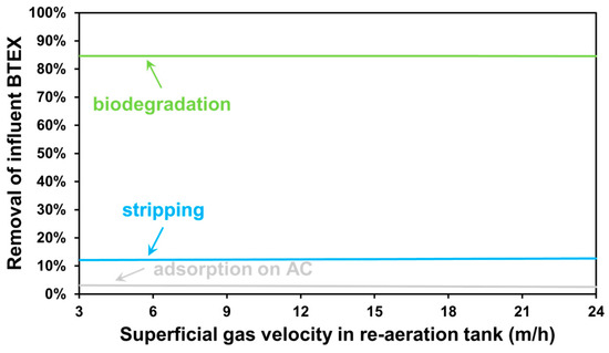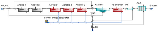 According to the model layout prepared for the study, portrayed by Figure 1, as a fictive retrofit of the municipal plant with effluent purification, the scope of the standard BSM1 configuration was extended with a granular activated carbon process and a microfiltration step prior to GAC for the sake of mechanical protection against the remaining solids overflowing from the secondary clarifiers. In the granular activated carbon unit process model, the replacement frequency of the exhausted bed is determined based on the TOC adsorption capacity of the media and the load of soluble organics removed. It can be run in either a quasi steady-state mode, where the AC demand is quantified from an instantaneous carbon mass balance, or in dynamic mode, where it is calculated cyclically, based on the effluent quality predicted using an empirical asymmetric breakthrough curve. The total bed volume of the towers was sized as 50 m3; with the effluent quality and quantity associated with the BSM1 use case, this ought to require bed replacement roughly every month, assuming that the bed density is 450 kg m−3 and that the soluble organic carbon adsorption capacity of the bed is 0.2 gC gAC−1, estimated based on operational expertise. The MF and GAC units are backwashed in half-hour and daily cycles, respectively, for industrial safety reasons against solids depositing on the filter and the granular media. We note here that bed replacement can be calculated automatically in Sumo22 from the mass flow of the BTEX compounds removed, simulating how—in a full-scale treatment plant—the operators would remove exhausted granules and reinstall fresh granules periodically, whenever the breakpoint of the media is reached. After sedimentation, an additional re-aeration zone with the hydraulic retention time of 0.3 h—with coarse bubble aeration—is used to maintain sufficient dissolved oxygen levels required for the effluent quality. The influent quality regarding BTEX concentrations was characterized according to typical levels in municipal wastewater, containing 303 µg L−1 of benzene, 290 µg L−1 of toluene, 249 µg L−1 of ethylbenzene and 933 µg L−1 of xylene [64].