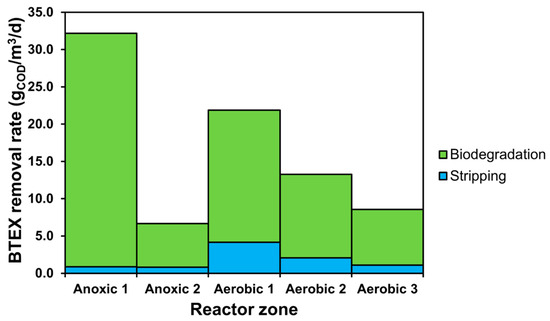 Fundamentally, the presence of dissolved oxygen (usually introduced through mechanical aeration) and chemically bound oxygen (in anoxic conditions) or the complete absence of oxygen (in anaerobic conditions) define the environmental conditions that support the growth and survival of biomass. In each environment, the BTEX removal kinetics were investigated; high biodegradation could be expected in aerobic conditions [18], while the buildup of toxic metabolites led to the incomplete degradation of both xylene and benzene, whether they were present as individual components or as a mixture. The addition of another pollutant always resulted in competition and inhibition, with xylene being the most inhibitory [19], whilst the external carbon source could cause enrichment on BTEX degradation by bacterial cultures [20]. Anaerobic conditions could be developed in packed bed reactors or deeper layers of the biofilm, which could also show significant biodegradation [21].