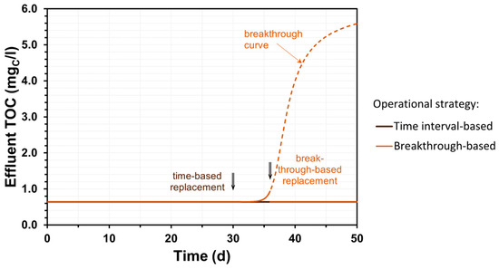 The replacement frequency can also be fixed based on the lifespan of the AC media. The cyclical process flow model schedules replacement events either based on the lifespan or relying on breakthrough-based or volumetric load-based maintenance logic. In the case of the breakthrough-based approach, either the amount of the total adsorbed carbon per bed volume EQC,ad,total is monitored and compared to the BTC or the effluent TOC is monitored and compared to a TOC concentration threshold to trigger the bed replacement procedure. Regarding the volumetric load-based logic, the influent loading expressed in the number of bed volumes is registered and initiates the replacement process when it reaches the target volume ratio of the load per bed.