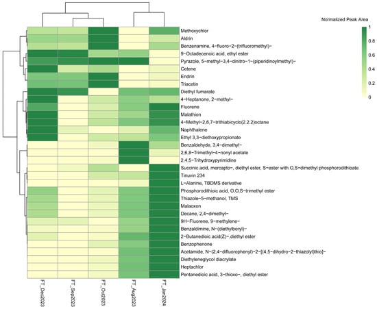 Heatmap illustrating the normalized responses of the identified organic compounds at the FT across all sampling events.