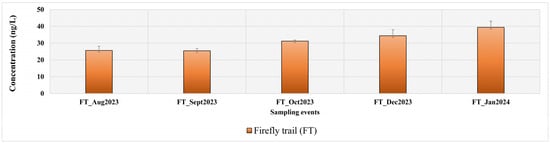 Conducting a comprehensive assessment of the organic compound levels in the North Oconee River, Georgia, we focused on a particular sampling site—Firefly Trail (FT) in Athens (Figure 1). This site was strategically selected due to its proximity to residential and industrial areas, making it susceptible to urban runoff. The study spanned five sampling events from August 2023 to January 2024 (Table 1).