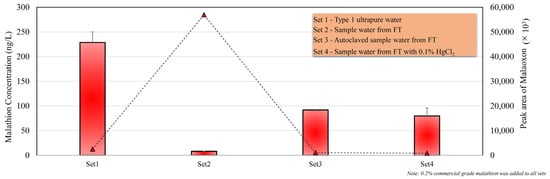 Graph depicting malathion concentration (ng/L) (plotted in the bar graph) and peak areas (×103) of malaoxon (plotted in line graph) in four experimental sets. Set 1 includes type 1 ultrapure water spiked with 0.2% malathion, set 2 consists of river water from FT spiked with 0.2% malathion, set 3 features autoclaved river water from FT spiked with 0.2% malathion, and set 4 comprises river water from FT spiked with HgCl2 (resulting final concentration of 0.1%) and 0.2% malathion.