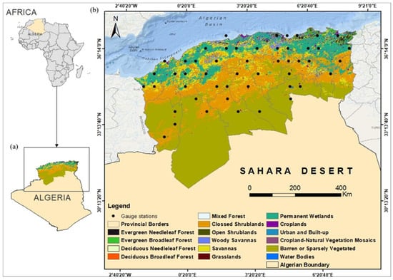 Location of the study area in northern Algeria (a). Land cover map of the northern part of Algeria and the location of weather stations falling within the study area (b).