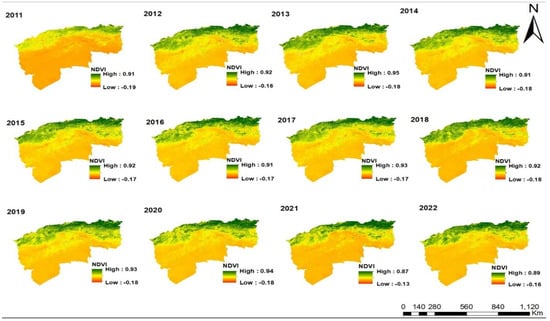 Spatial distribution of the mean NDVI for each year’s growing season from 2011 to 2022.