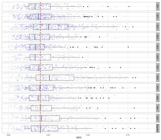 The northern section of the region, notably the coastal provinces of Skikda, Tizi-Ouzou, Jijel, Annaba, El Tarf, Béjaa, Tipaza, and Algiers, had higher NDVI values than the southern section, which encompasses a large percentage of the study area (Figure 2). The year 2013 had the highest maximum NDVI value (0.95), and the maximum NDVI value for all of the other years varied from 0.87 to 0.94. We also analyzed the distribution of NDVI values from 2011 to 2022 against the long-term NDVI (2000–2010) (Figure 3). The boxplots were consistently right-skewed, indicating the predominance of low NDVI pixel values. The median NDVI values across all years consistently fell below 0.25. Most years demonstrated a relatively stable NDVI value distribution, with notable exceptions in 2013, 2018, and 2022, where the medians were higher than the long-term NDVI.