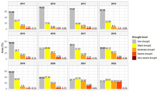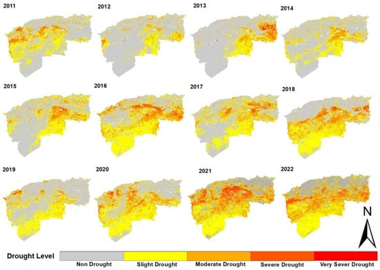 The western and central sections experienced more drought in 2011, while the eastern and south-eastern regions were mainly affected by drought in 2013 and 2017 (Figure 5). Similarly, in 2018, the entire southern part of the study area suffered from drought. During 2016, 2018, 2021, and 2022, the drought affected almost the entire study area, but with varying degrees of severity.