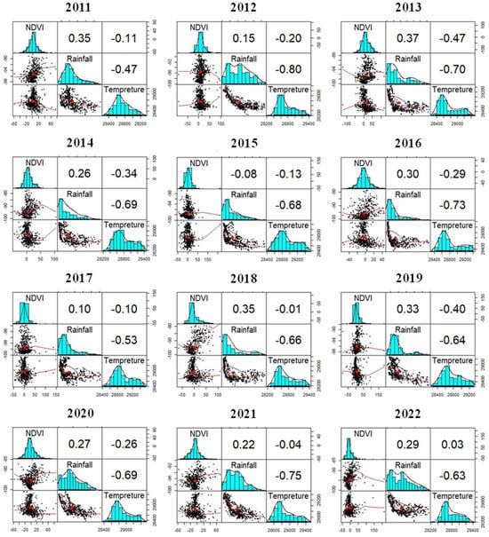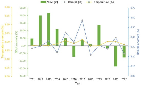 In addition to NDVI anomalies, we also determined anomalies for rainfall and temperature (Table 1). A 30-year long-term average spanning from 1990 to 2020 was calculated for these climatic variables, following the recommendation of the World Meteorological Organization (WMO) [85]. To ensure uniformity, rainfall and temperature anomalies were computed for the identical time frame (2011–2022) as that of the NDVI anomaly.