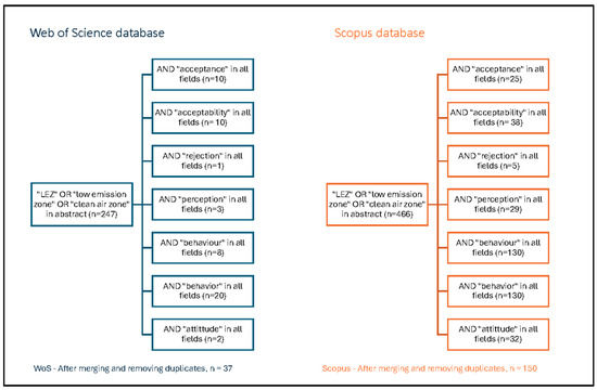 For the first step, a search was made in the literature using the Web of Science (WoS) and Scopus databases, which have been widely used for performing reviews and are considered consistent repositories when searching for scientific publications. The search was carried out by using the following terms in the abstract: [LEZ; “low emission zone”; “clean air zone”] AND the following terms in all fields: [acceptance; acceptability; rejection; perception; behavior; behaviour; attitude]. The search was restricted to peer-reviewed documents written in English and published as journal articles, conference papers, early access, proceeding papers, review articles, editorial material, correction articles, and book chapters available in both databases until 23 February 2024. As shown in Figure 1, after merging and removing duplicates, 37 documents were obtained in the WoS database and 150 documents in the Scopus database.