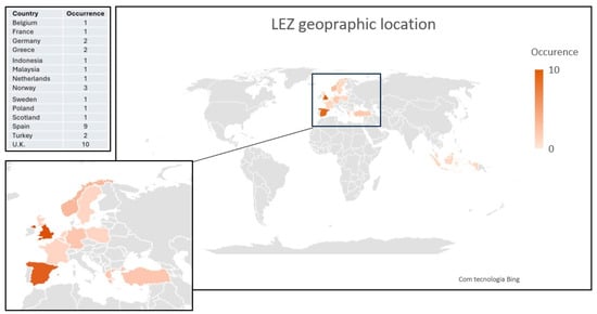 As expected, given the number of LEZs implemented in Europe, it is observed that the articles mostly address European LEZs, as can be seen in the map in Figure 3. The large concentration of articles focusing on LEZs in the United Kingdom (28%) and Spain (25%) stands out. Outside Europe, there is only one article on a Malaysian LEZ and one on an Indonesian LEZ.